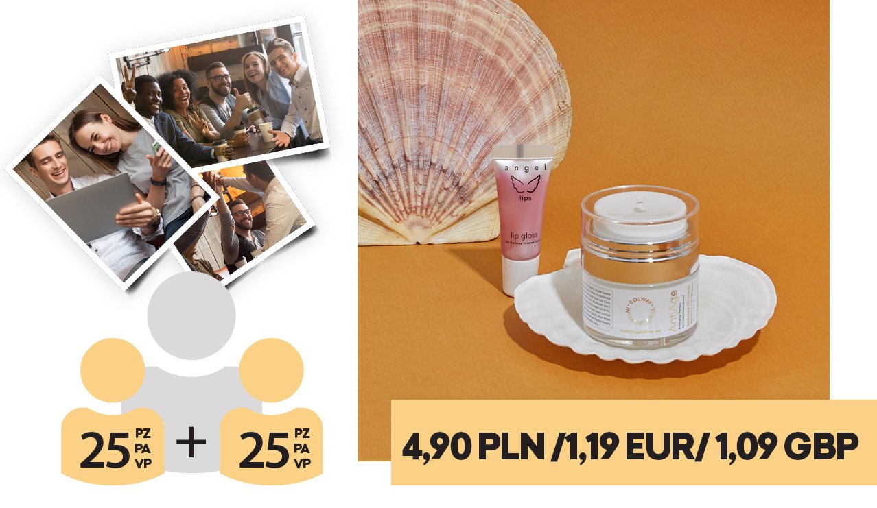 Register at least 2 people with orders of value 25 VP each. Send to us a
